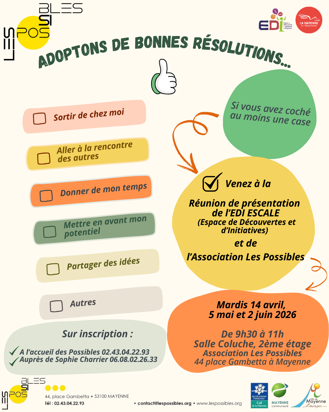 1 – Celle de l’association «Les Possibles» qui conduit et développe son projet social autour de valeurs de dignité, de démocratie et de solidarité, en favorisant l’initiative citoyenne des habitants, en prenant en compte les questions de la famille, de la jeunesse, de la vie de quartier, des loisirs et de l’insertion sociale. 2 – Celle du Conseil Départemental de la Mayenne qui, pour répondre aux problématiques d’isolement, a mis en place un partenariat avec les acteurs locaux des Espaces de Découvertes et d’Initiatives, actuellement au nombre de 10, répartis sur le département de la Mayenne. – Faciliter la création de lien social – Aider à exprimer les savoirs de chacun et les valoriser – Favoriser le mieux être, la reconnaissance et la redynamisation – Permettre l’accès à la culture, aux loisirs et aux sports – Encourager les initiatives, la participation à la vie locale Cet espace s’adresse à toutes les personnes désireuses d’aller à la rencontre des autres et plus spécifiquement, aux personnes souffrant d’isolement social et ayant besoin d’être accompagnées dans leurs démarches. Au travers de multiples propositions, l’Escale tend à faciliter et accompagner la démarche des personnes vers une ouverture sur le territoire en mettant en avant leurs capacités à faire, à être et à participer à la vie locale. L’Escale se situe à l’interface des individus et des actions existantes. L’action s’articule autour d’une approche individuelle et le développement d’espaces et temps d’accueils collectifs. La chargée d’insertion, propose des temps de permanence où chacun peut être reçu individuellement en tout confidentialité. – Les espaces rencontres – L’atelier Autour du livre – L’Escale propose des temps collectifs, réguliers ou plus ponctuels, pour faciliter le lien social – L’atelier expression par l’écriture « P(r)ose tes mots » – Les sorties découvertes (visite de musée, sortie au bord de la mer…) – La possibilité de mettre en place des activités plus spécifiques en fonction des attentes et besoins, avec des intervenants extérieurs à la structure (Atelier santé avec Promotion Santé Pays de la Loire…) – Des temps co-animés avec les autres professionnels de l’association Les Possibles (Le sport autrement, l’accompagnement sur une fonction bénévoles…) – Des temps co-portés avec des institutions, associations partenaires (Troc plantes…) Laisser Parler Les Petits Papiers Depuis juin 2021, des accueils sont proposés sur Lassay les Châteaux pour les personnes habitant le nord de Mayenne Communauté Contact : Patricia Conan – p.conan@lespossibles.org – 06.74.89.91.00