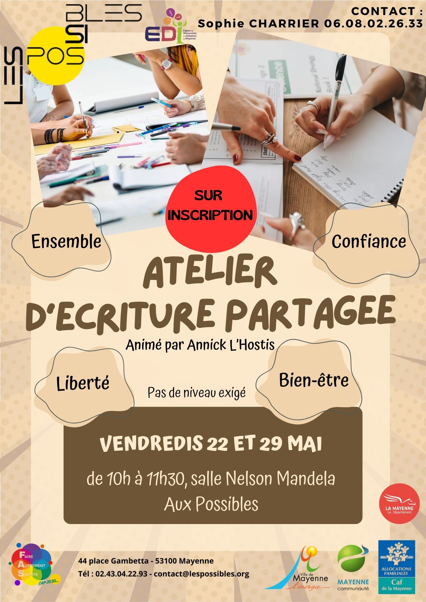 •Actualités Actualité • Ateliers d’écriture partagée • Ateliers d’écriture partagée Thématique Mayenne communauté Nos actions Entreprendre A votre service AUTRES ACTUALITÉS DU MOMENT AUTRES ACTUALITÉS À CONSULTER dans {{ p.custom_fields.thematique_actualite[0] }}
