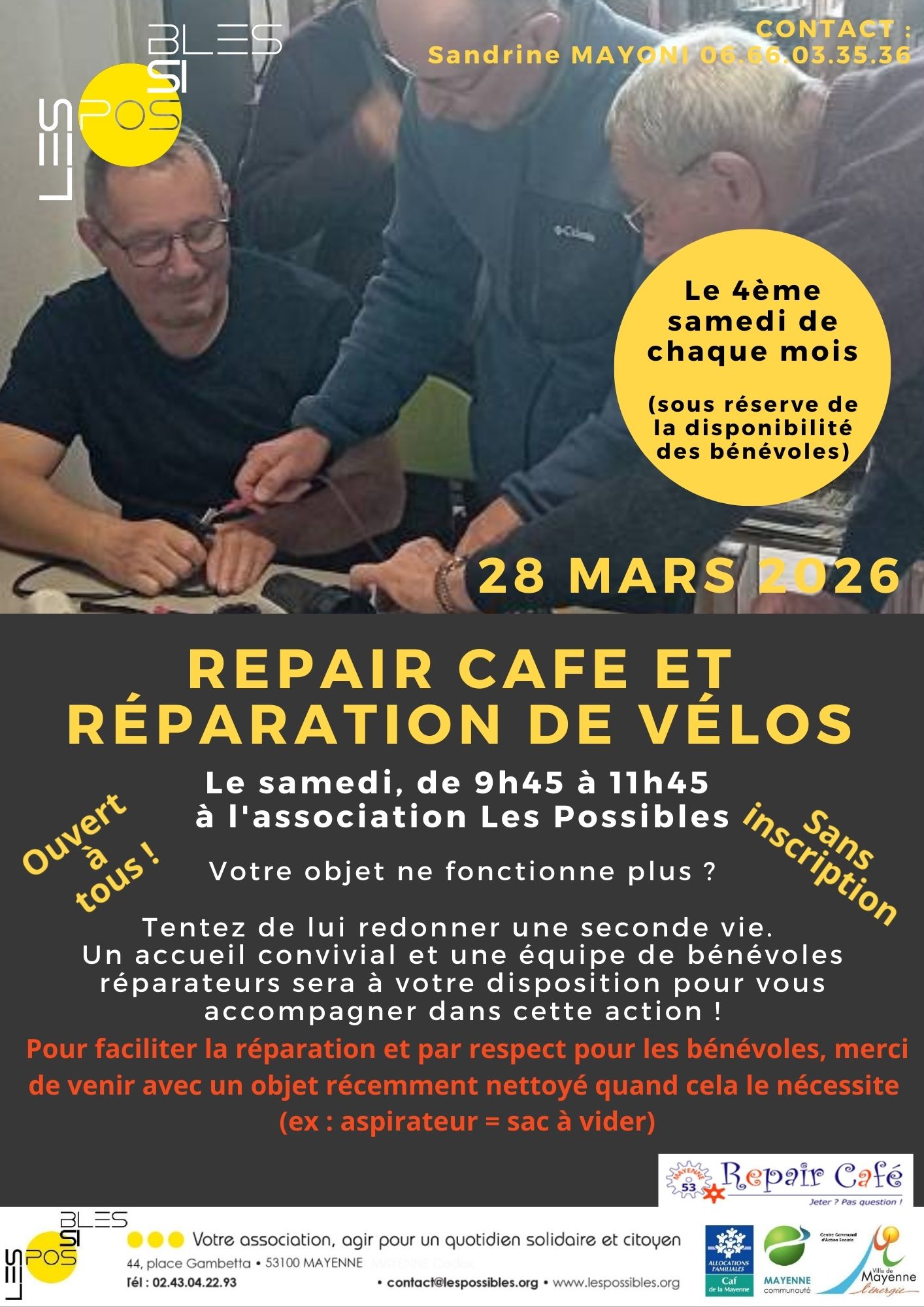 •Actualités Actualité • Repair café, le 24 janvier... • Repair café, le 24 janvier 2026 Thématique Mayenne communauté Nos actions Entreprendre A votre service AUTRES ACTUALITÉS DU MOMENT AUTRES ACTUALITÉS À CONSULTER dans {{ p.custom_fields.thematique_actualite[0] }}