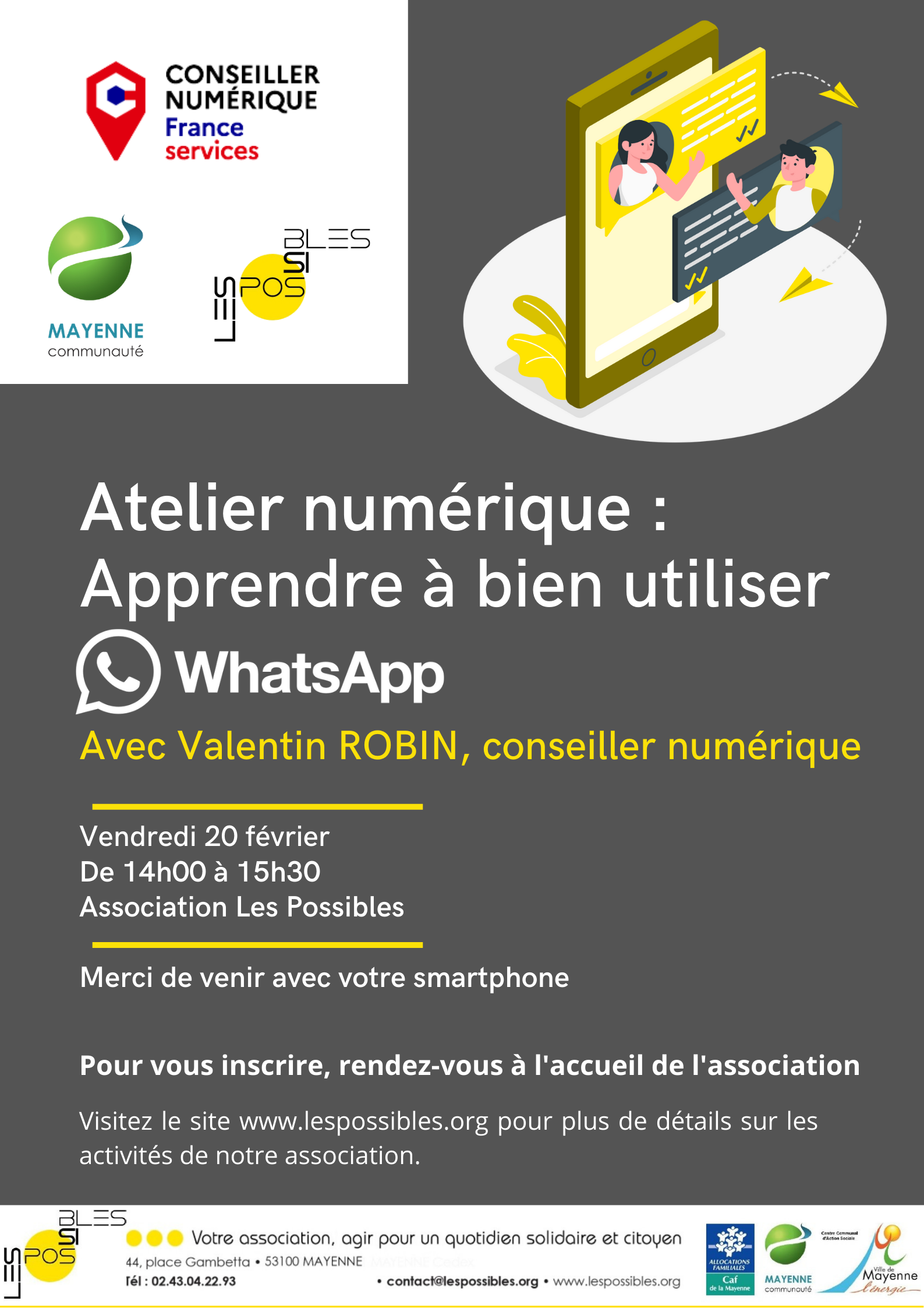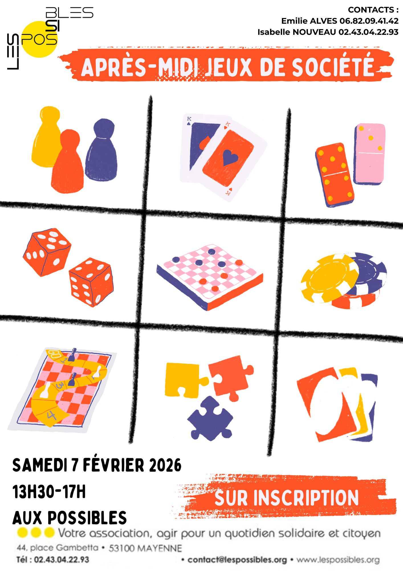 Sur rendez-vous avec Valentin Robin, conseiller numérique, Atelier Apprendre A Bien Utiliser WhatsApp ♦ DON DU SANG Une fois par mois, des adhérents de l’association Les Possibles se réunissent pour cuisiner ensemble, à partir de 9 h, à la maison des Familles de Brossolette ou à l’association Les Possibles (une fois sur deux) et organiser le temps de repas du midi. Les menus et recettes sont proposés et choisis de manière collective auparavant. Le temps du repas réunit les adhérents inscrits, les animatrices et des infirmiers du CMP. Ce temps est ouvert à tous, sous réserve d’être adhérent à l’association Les Possibles et de s’être inscrit pour le repas. Une fois par semaine, le jeudi de 14h à 16h à la maison des Familles de Brossolette, ce temps d’accueil collectif permet à tout à chacun d’échanger sur des thèmes de la vie quotidienne, de l’actualité. Il est co-animé par deux professionnelles de l’association Les Possibles et un infirmier du CMP, avec des présences ponctuelles d’intervenants selon les demandes. Chaque année, ce temps convivial est organisé par des adhérents de l’association Les Possibles, dans l’objectif de favoriser les rencontres, les échanges intergénérationnels et culinaires autour d’animations ludiques et de tables partagées. Organisées selon la demande et l’investissement des adhérents de l’association Les Possibles, elles sont accompagnées dans leurs mises en place par l’animatrice. (soirée jeu de société, nettoyage des extérieurs, animations diverses…) Contacts : Maison des familles de Brossolette : Noémie Houssemaine n.houssemaine@lespossibles.org – 06.80.68.84.63 Maison de quartier de l’Angellerie : Sandrine Mayoni s.mayoni@lespossibles.org – 06 66 03 35 36Les Possibles vous recommandent : Programme Journée Alimentation Santé 5 Février 2026 le jeudi 5 février 2026
