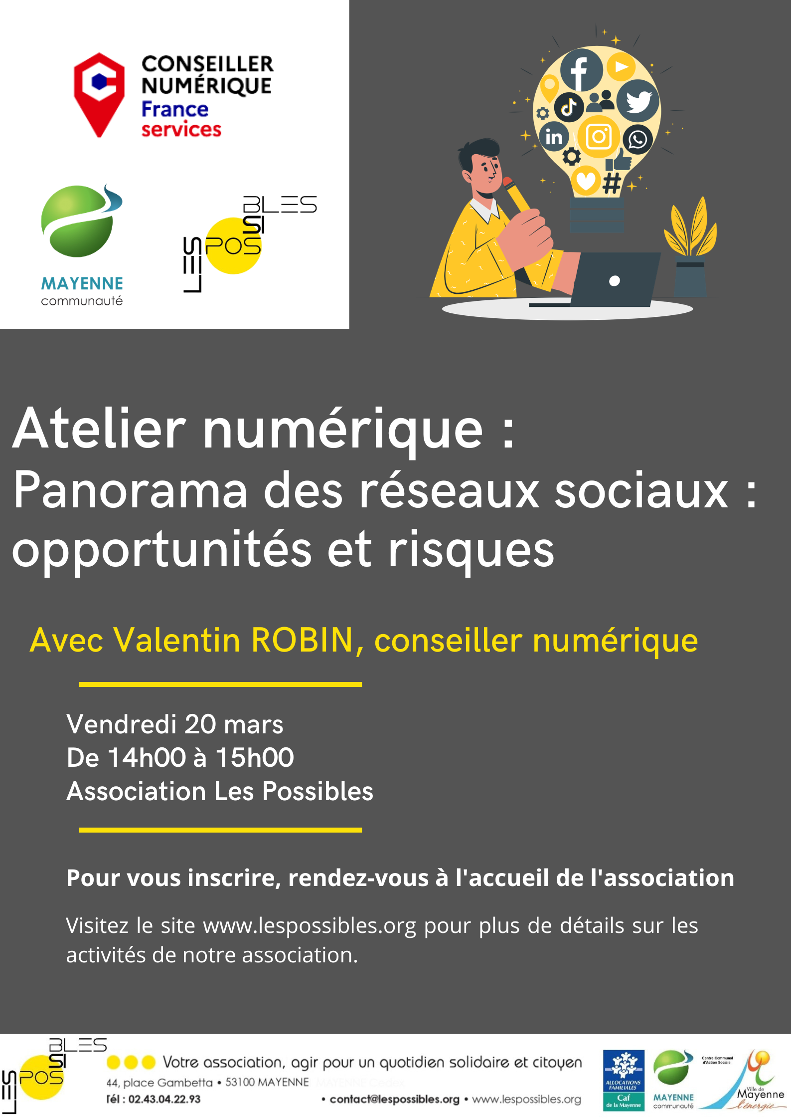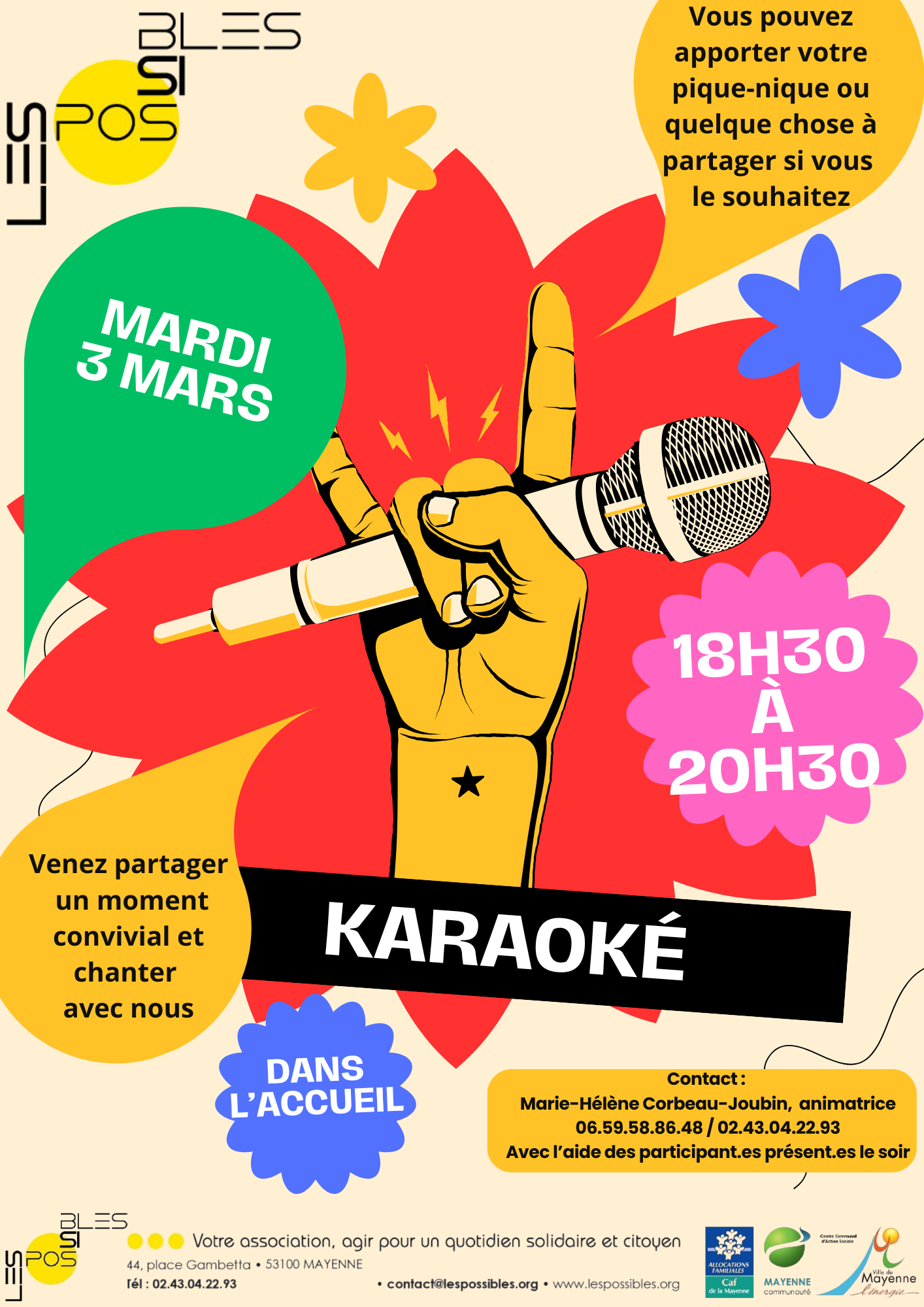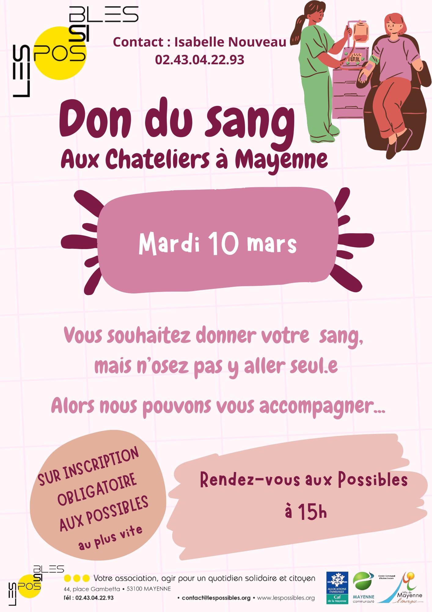 Sur rendez-vous avec Valentin Robin, conseiller numérique, ♦ DON DU SANG Une fois par mois, des adhérents de l’association Les Possibles se réunissent pour cuisiner ensemble, à partir de 9 h, à la maison des Familles de Brossolette ou à l’association Les Possibles (une fois sur deux) et organiser le temps de repas du midi. Les menus et recettes sont proposés et choisis de manière collective auparavant. Le temps du repas réunit les adhérents inscrits, les animatrices et des infirmiers du CMP. Ce temps est ouvert à tous, sous réserve d’être adhérent à l’association Les Possibles et de s’être inscrit pour le repas. Une fois par semaine, le jeudi de 14h à 16h à la maison des Familles de Brossolette, ce temps d’accueil collectif permet à tout à chacun d’échanger sur des thèmes de la vie quotidienne, de l’actualité. Il est co-animé par deux professionnelles de l’association Les Possibles et un infirmier du CMP, avec des présences ponctuelles d’intervenants selon les demandes. Chaque année, ce temps convivial est organisé par des adhérents de l’association Les Possibles, dans l’objectif de favoriser les rencontres, les échanges intergénérationnels et culinaires autour d’animations ludiques et de tables partagées. Organisées selon la demande et l’investissement des adhérents de l’association Les Possibles, elles sont accompagnées dans leurs mises en place par l’animatrice. (soirée jeu de société, nettoyage des extérieurs, animations diverses…) Contacts : Maison des familles de Brossolette : Noémie Houssemaine n.houssemaine@lespossibles.org – 06.80.68.84.63 Maison de quartier de l’Angellerie : Sandrine Mayoni s.mayoni@lespossibles.org – 06 66 03 35 36