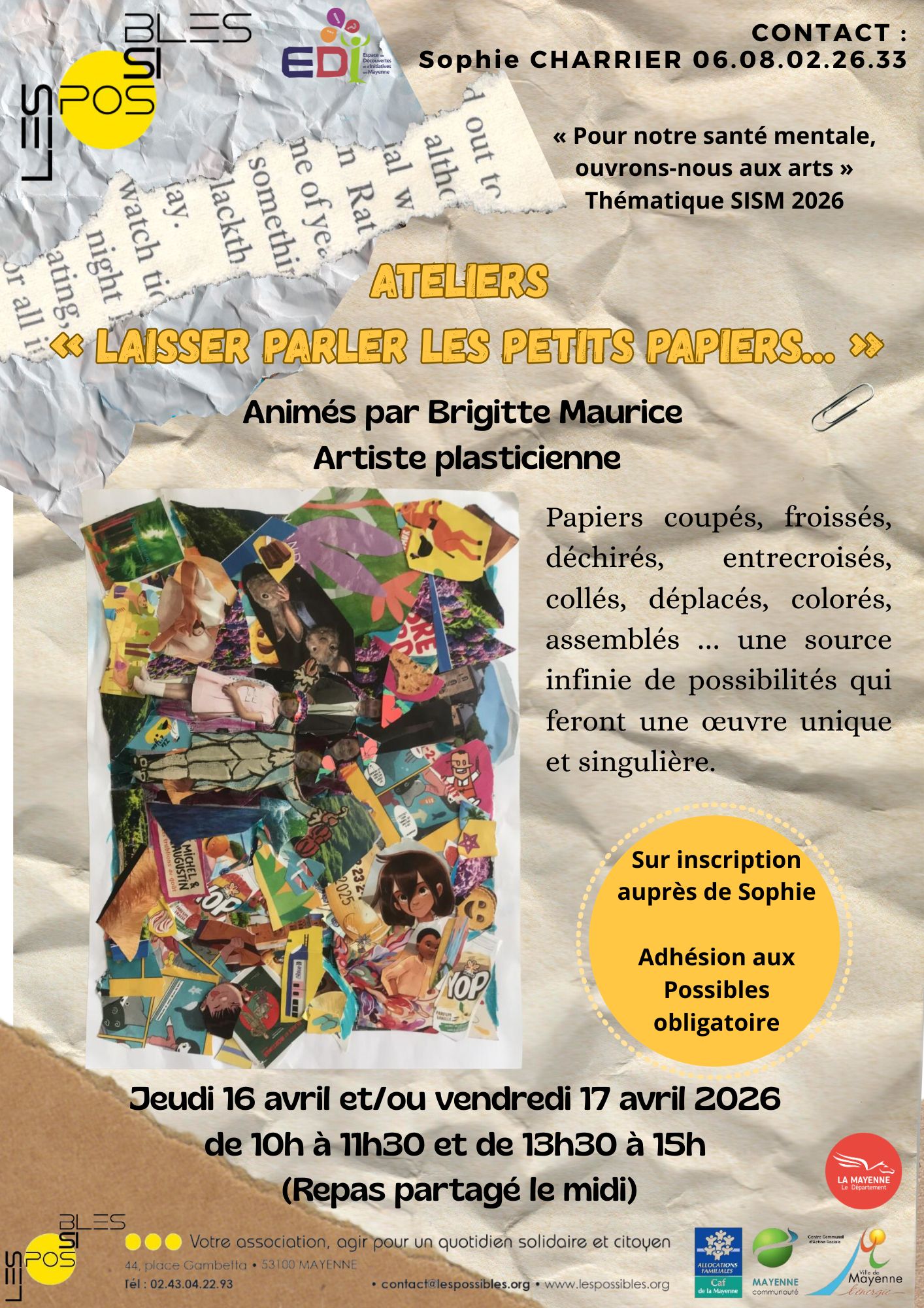 1 – Celle de l’association «Les Possibles» qui conduit et développe son projet social autour de valeurs de dignité, de démocratie et de solidarité, en favorisant l’initiative citoyenne des habitants, en prenant en compte les questions de la famille, de la jeunesse, de la vie de quartier, des loisirs et de l’insertion sociale. 2 – Celle du Conseil Départemental de la Mayenne qui, pour répondre aux problématiques d’isolement, a mis en place un partenariat avec les acteurs locaux des Espaces de Découvertes et d’Initiatives, actuellement au nombre de 10, répartis sur le département de la Mayenne. – Faciliter la création de lien social – Aider à exprimer les savoirs de chacun et les valoriser – Favoriser le mieux être, la reconnaissance et la redynamisation – Permettre l’accès à la culture, aux loisirs et aux sports – Encourager les initiatives, la participation à la vie locale Cet espace s’adresse à toutes les personnes désireuses d’aller à la rencontre des autres et plus spécifiquement, aux personnes souffrant d’isolement social et ayant besoin d’être accompagnées dans leurs démarches. Au travers de multiples propositions, l’Escale tend à faciliter et accompagner la démarche des personnes vers une ouverture sur le territoire en mettant en avant leurs capacités à faire, à être et à participer à la vie locale. L’Escale se situe à l’interface des individus et des actions existantes. L’action s’articule autour d’une approche individuelle et le développement d’espaces et temps d’accueils collectifs. La chargée d’insertion, propose des temps de permanence où chacun peut être reçu individuellement en tout confidentialité. – Les espaces rencontres – L’atelier Autour du livre – L’Escale propose des temps collectifs, réguliers ou plus ponctuels, pour faciliter le lien social – L’atelier expression par l’écriture « P(r)ose tes mots » – Les sorties découvertes (visite de musée, sortie au bord de la mer…) – La possibilité de mettre en place des activités plus spécifiques en fonction des attentes et besoins, avec des intervenants extérieurs à la structure (Atelier santé avec Promotion Santé Pays de la Loire…) – Des temps co-animés avec les autres professionnels de l’association Les Possibles (Le sport autrement, l’accompagnement sur une fonction bénévoles…) – Des temps co-portés avec des institutions, associations partenaires (Troc plantes…) Laisser Parler Les Petits Papiers Depuis juin 2021, des accueils sont proposés sur Lassay les Châteaux pour les personnes habitant le nord de Mayenne Communauté Contact : Patricia Conan – p.conan@lespossibles.org – 06.74.89.91.00