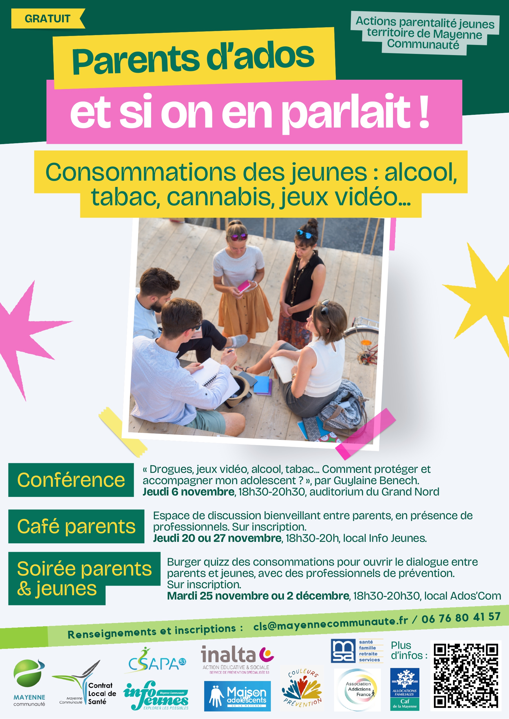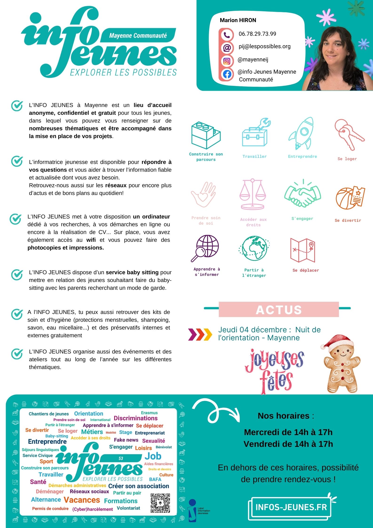 L’Info Jeunes Argent de poche Pendant les vacances scolaires, proposition de chantiers citoyens pour les jeunes, habitant Mayenne Ville, 16 (ans révolus) – 18 ans (jusqu’à la veille des 19 ans) indemnisés 15 € pour 3 h de chantier. C’est un dispositif conjointement mené entre la ville et l’association Les Possibles pour encourager d’une part, l’engagement des jeunes auprès des associations locales et d’autres part, découvrir sa ville en intervenant auprès des services techniques ainsi qu’auprès des établissements publics. Les groupes oscillent entre 2 et 6 jeunes accueillis sur 5 demi-journées en moyenne. Vous pouvez obtenir un dossier “argent de poche” valable toute l’année civile en cours, pour les documents à joindre. En revanche le retrait du dossier pour les documents à compléter est à retirer avant chaque cession, en cliquant sur les 4 liens ci-dessous. Tous les documents sont à retourner à l’accueil de l’association Les Possibles ou par mail à contact@lespossibles.org avec les pièces administratives demandées : Dossier d’inscription et Autorisation Parentale Contact : Avec la collaboration de bénévoles encadrants Les mardis et jeudis, de 16h à 17h30 Contact : Noémie Houssemaine Avec la collaboration de bénévoles encadrants Les lundis et jeudis, de 16h à 17h30 Contact : Sandrine Mayoni Avec la collaboration de bénévoles encadrants Les mardis et jeudis, de 16h30 à 18h30 Contact : Emilie Alves Avec la collaboration de bénévoles encadrants Les mardis et jeudis, de 16h à 17h30 Contact : Marie-Hélène Corbeau-Joubin Emilie Alves : e.rangeard@lespossibles.org 06.82.09.41.42 Marie-Hélène Corbeau-Joubin : mh.joubin@lespossibles.org 06.59.58.86.48 Noémie Houssemaine : n.houssemaine@lespossibles.org 06.80.68.84.63 Sandrine Mayoni : s.mayoni@lespossibles.org 06.66.03.35.36