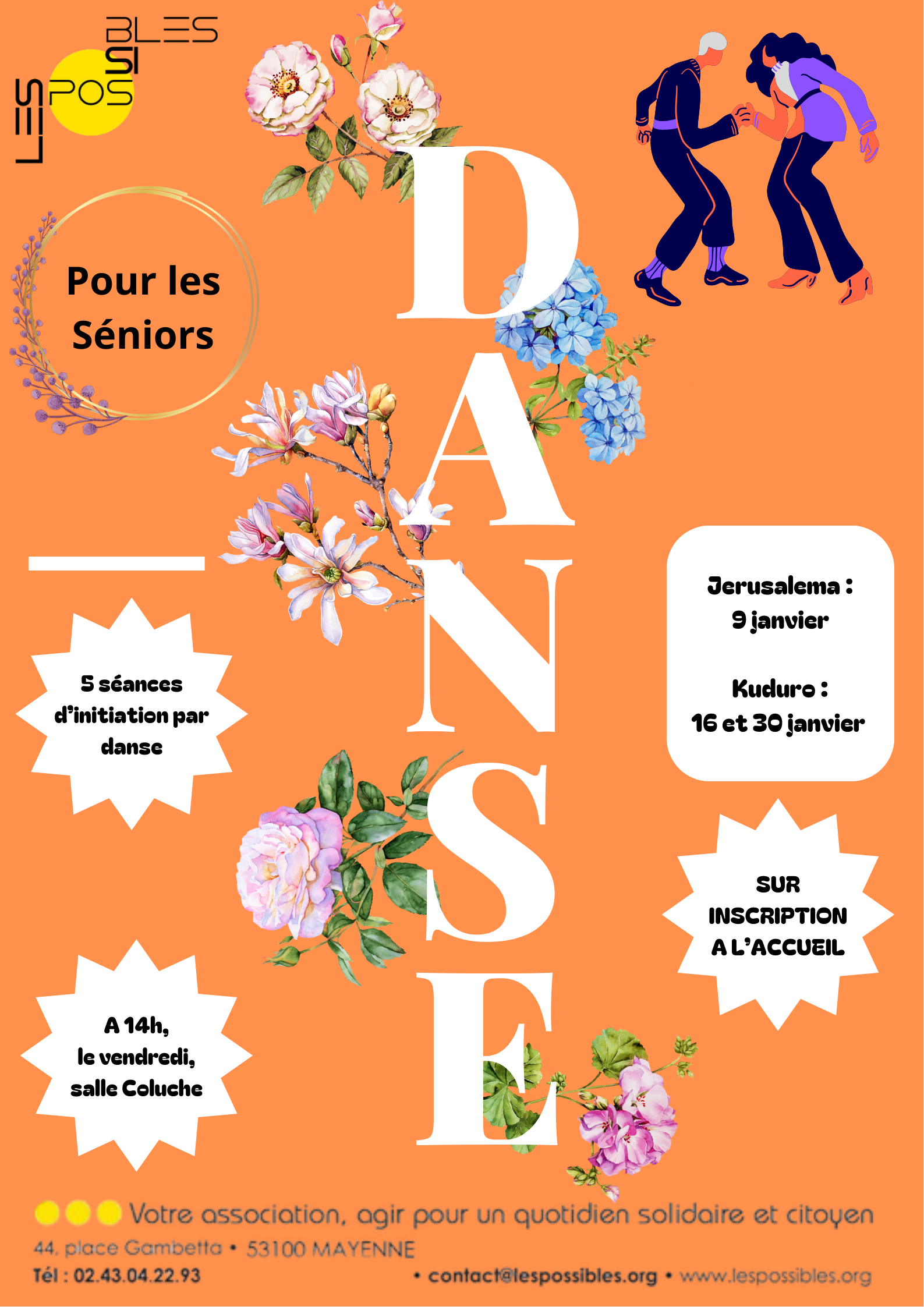 Un axe d’intervention auprès du public senior s’est construit à l’association Les Possibles. Celui-ci répond au projet associatif. Nous ouvrons la parole aux 60 ans et plus, afin de recueillir leurs besoins et attentes sur le territoire de Mayenne. Un questionnaire est mis à disposition “Questionnaire projet senior et bien vieillir” à l’accueil de l’association. N’hésitez pas à venir le remplir. A l’association Les Possibles, quelques projets émergent afin de palier aux problématiques d’isolement et de solitude (goûter et jeux de société, diverses sorties…) Ces projets en rejoignent d’autres, déjà existants, comme “le sport autrement”… Mercredis 14 janvier, 11 février, 11 mars, 8 avril, 13 mai et 17 juin à 10h Plusieurs exercices ludiques pour stimuler sa mémoire SUR INSCRIPTION A L’ACCUEIL Des exercices mécaniques, pratiques et simples pour revenir aux sensations du corps quand le mental est trop présent. Améliorer son sommeil, apaiser ses douleurs, évacuer ses tensions, améliorer sa concentration, prendre soin de sa santé mentale et de son corps. « Le groupe pour le lien, le partage et la convivialité » Lundis 5 janvier, 26 janvier, 9 février, 2 mars, 23 mars De 11h30 à 12h30, salle Coluche Proposée par Cindy Pauloin, sophrologue Tarif : 10 € les 15 prestations (10 séances + 5 balades sensorielles) SUR INSCRIPTION A L’ACCUEIL Les difficultés sociales, financières, de santé, impactent l’estime de soi et la confiance en soi. La socio-esthétique consiste à utiliser le soin du bien-être auprès des personnes qui sont face à ces difficultés de la vie, hommes et femmes. Revalorisation de l’image de soi par un travail sur le corps, Faciliter le lâcher prise, la détente et le mieux-être, Améliorer la confiance en soi, Trouver ou retrouver le plaisir à s’occuper de soi et à prendre du temps pour soi, Favoriser les échanges et le lien social. Jeudis 15 janvier, 12 février et 5 mars + 1 date en avril communiquée ultérieurement De 13h30 à 15h30, salle Coluche Proposée par Eve Courteau, socio-esthéticienne SUR INSCRIPTION A L’ACCUEIL – Engagement sur toutes les séances Tarif : 10 € les 6 séances Une activité physique adaptée, ludique et conviviale pour les jeunes retraités et les seniors, animée par un professionnel qualifié. POURQUOI PARTICIPER ? ✔ Redécouvrir le plaisir du mouvement à son rythme ✔ Préserver sa santé physique et mentale ✔ Partager des moments de convivialité ✔ Découvrir de nouvelles pratiques sportives ✔ Être accompagné.e dans une ambiance sécurisante et bienveillante Le vendredi (sauf pendant les vacances scolaires) Un groupe, de 10h à 11h avec Stéphane BARRE de l’UFOLEP Un groupe, de 11h à 12h avec Bernard GUILLOT, adhérent des Possibles Tarif : 28 € (licence sportive) + adhésion à l’association Prévoir tenue adaptée, eau et bonne humeur ! SUR INSCRIPTION A L’ACCUEIL 5 séances d’initiation par danse Envie de bouger en douceur, de faire des rencontres et de passer un bon moment ? Ces séances, animées avec douceur et bonne humeur, vous permettront de garder la forme, de stimuler votre mémoire et surtout de partager des instants joyeux avec d’autres participants. Venez danser, échanger, rire… et créer de beaux souvenirs ensemble ! De 14h à 16h, salle Coluche Prochaines danses à définir. SUR INSCRIPTION A L’ACCUEIL Gratuit Contact : Noémie HOUSSEMAINE : 06.80.68.84.63 – n.houssemaine@lespossibles.org· Méninges & vous